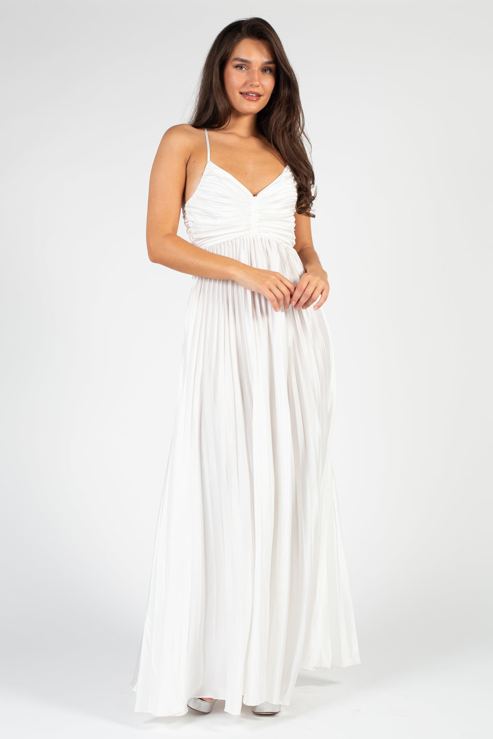 We're bringing all the boho vibes with the Zephyra Tie Back Satin Pleated Gown. This whimsical number allows for a relaxed comfortable fit with its flowy silhouette, adjustable spaghetti straps and elastic detailing at the waist. Complete with dreamy pleating throughout this dress is an easy decision for any occasion.